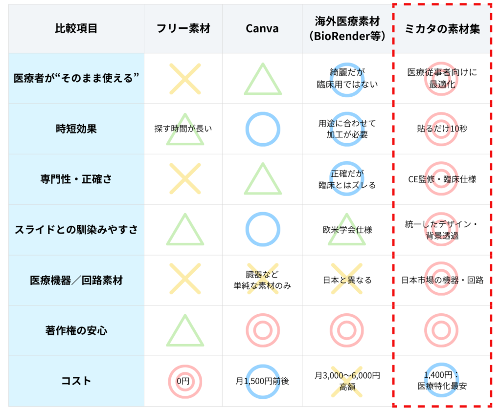 → だからミカタ素材だけが「日本の臨床者が本当に使える素材」になる。